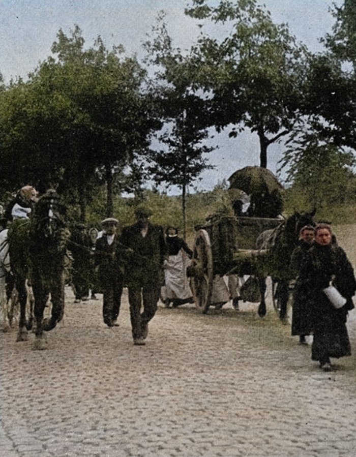 De arme lieden hadden hun huizen en hun goed in de brand gelaten, ze weenden om hun vee dat stampte en loeide van de angst. Ze hadden nog snel hier een daar een stuk speelgoed mee gegrist en met een kind aan de hand waren ze radeloos de steenweg opgelopen, de zwarte nacht in en een nog zwartere onbekende toekomst tegemoet. De donderende bommen vielen achter hen aan en schonden de boomkronen, velden de bomen en slingerden de grond in hun gezichten. De granaten barstten uiteen met een vreselijk geweld, doodden en kwetsten en de arme lieden liepen zonder omzien naar diegenen die kreunend neerzakten, als uitzinnigen door de brandende hellepoel. Op die manier waren deze mensen hun haarden ontvlucht, nog met de lompen die ze om hun lijf hadden.